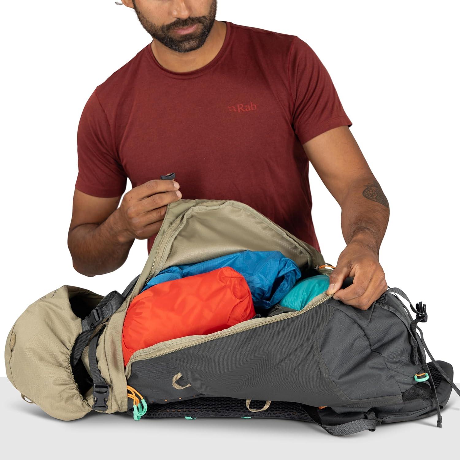 A rugged, streamlined take on the classic rucksack, this pack offers an adjustable men's fit and ample volume for overnights and short multi-day trips. An AirScape™ backpanel delivers cushioned, close-to-body comfort, while torso-length adjustability ensures a precise fit. Stash essentials in front shove-it and hipbelt pockets, plus a hidden side zipper to the main compartment. Raincover included.