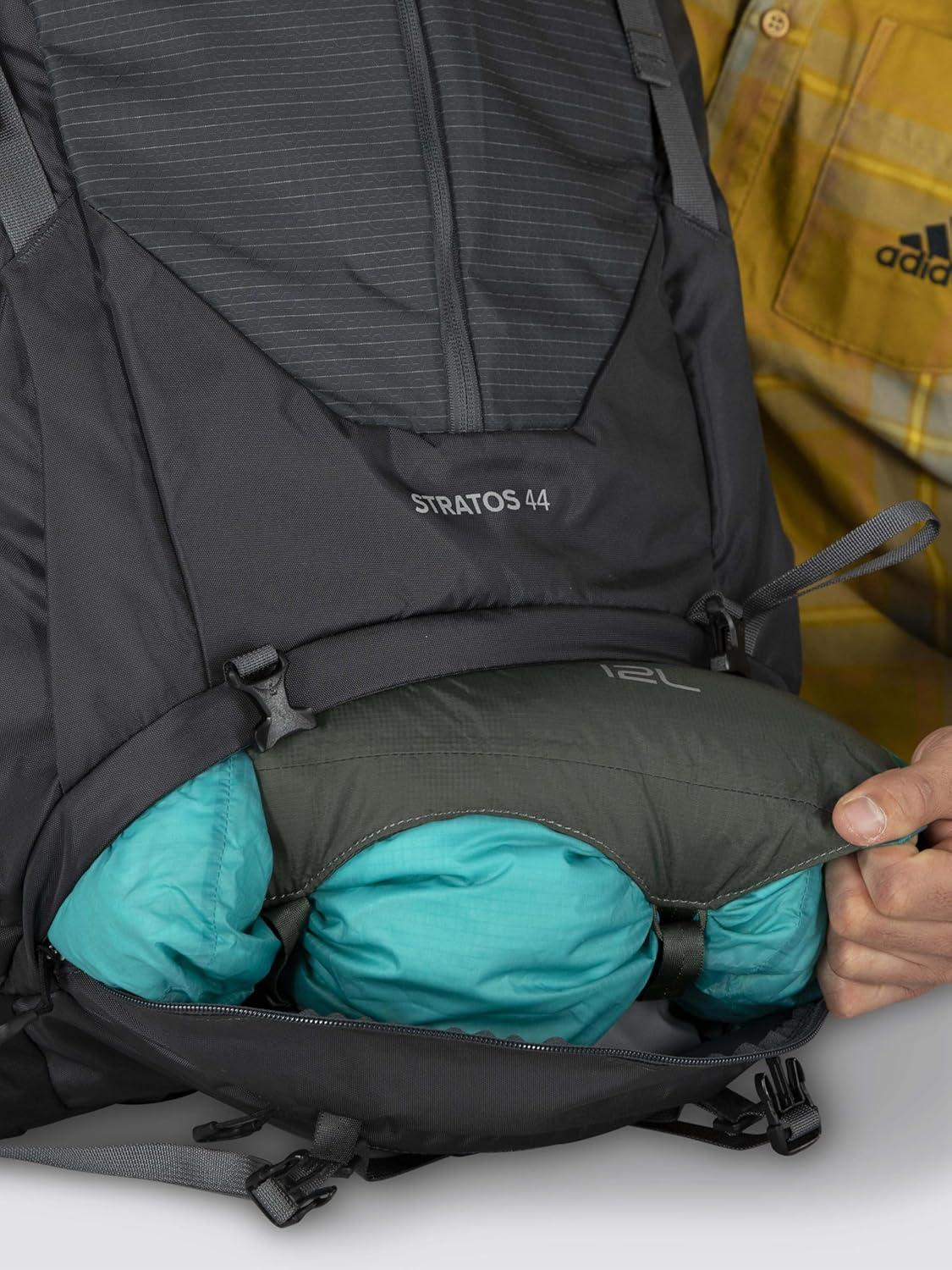 Enjoy cloudlike comfort with this exceptionally ventilated top-loading hiking pack. Offering an adjustable men's fit and spacious storage, the Stratos 44 lends cloudlike comfort to overnight missions. A hidden side-zip pocket grants additional storage, a collapsible lower compartment keep gear within reach, thoughtful pocketing wrangles small essentials and a raincover deploys when needed.